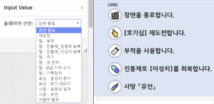 플레이어가 아이템을 쓰는 등, 각종 규칙 관련 선언을 빠르고 잘 보이게 출력합니다.