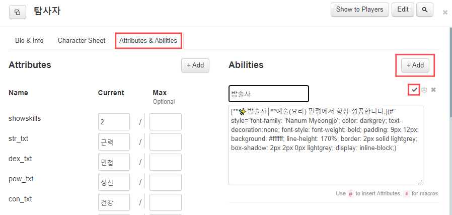 캐릭터 시트의 Attributes&Abilities 탭에서 Abilities 항목을 추가합니다. 데이터가 포함된 태그를 입력하고 체크를 눌러 등록합니다.