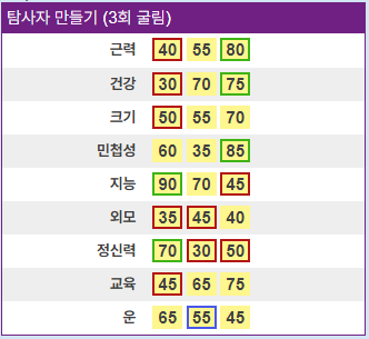 &{template:default} {{name=탐사자 만들기 (3회 굴림)}}{{근력 =[[3d6*5]] [[3d6*5]] [[3d6*5]]}}{{건강 =[[3d6*5]] [[3d6*5]] [[3d6*5]]}}{{크기 =[[(2d6+6)*5]] [[(2d6+6)*5]] [[(2d6+6)*5]]}}{{민첩성 =[[3d6*5]] [[3d6*5]] [[3d6*5]]}}{{지능 =[[(2d6+6)*5]] [[(2d6+6)*5]] [[(2d6+6)*5]]}}{{외모 =[[3d6*5]] [[3d6*5]] [[3d6*5]]}}{{정신력 =[[3d6*5]] [[3d6*5]] [[3d6*5]]}}{{교육 =[[(2d6+6)*5]] [[(2d6+6)*5]] [[(2d6+6)*5]]}}{{운 =[[3d6*5]] [[3d6*5]] [[3d6*5]]}}