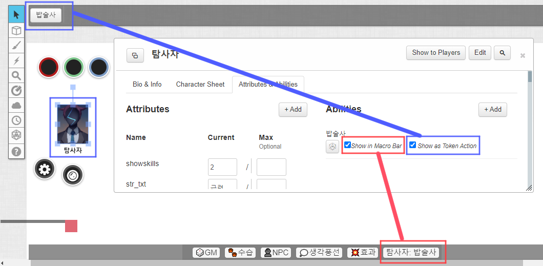 Show as Token Action 을 체크하면 맵에 존재하는 캐릭터 토큰을 클릭했을 때 상단에 등록한 매크로 버튼이 나옵니다.