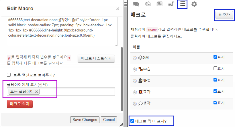 매크로 등록은 우측 상단의 콜렉션 메뉴에서 할 수 있습니다. 매크로 퀵 바 표시를 체크하면 매크로를 빠르게 사용할 수 있는 하단 바가 생성됩니다. 매크로 사용할 권한을 플레이어에게도 부여하려면 각 매크로에 플레이어 표시 '모든 플레이어'를 등록합니다.