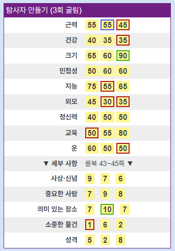&{template:default} {{name=탐사자 만들기 (3회 굴림)}}{{근력 =[[3d6*5]] [[3d6*5]] [[3d6*5]]}}{{건강 =[[3d6*5]] [[3d6*5]] [[3d6*5]]}}{{크기 =[[(2d6+6)*5]] [[(2d6+6)*5]] [[(2d6+6)*5]]}}{{민첩성 =[[3d6*5]] [[3d6*5]] [[3d6*5]]}}{{지능 =[[(2d6+6)*5]] [[(2d6+6)*5]] [[(2d6+6)*5]]}}{{외모 =[[3d6*5]] [[3d6*5]] [[3d6*5]]}}{{정신력 =[[3d6*5]] [[3d6*5]] [[3d6*5]]}}{{교육 =[[(2d6+6)*5]] [[(2d6+6)*5]] [[(2d6+6)*5]]}}{{운 =[[3d6*5]] [[3d6*5]] [[3d6*5]]}}{{세부 사항 = ▼ 룰북 43~45쪽 ▼ }}{{사상·신념 =[[1D10]] [[1D10]] [[1D10]]}}{{중요한 사람 =[[1D10]] [[1D10]] [[1D10]]}}{{의미 있는 장소 =[[1D10]] [[1D10]] [[1D10]]}} {{소중한 물건 =[[1D10]] [[1D10]] [[1D10]]}} {{성격 =[[1D10]] [[1D10]] [[1D10]]}}