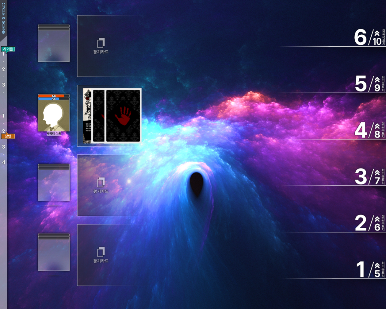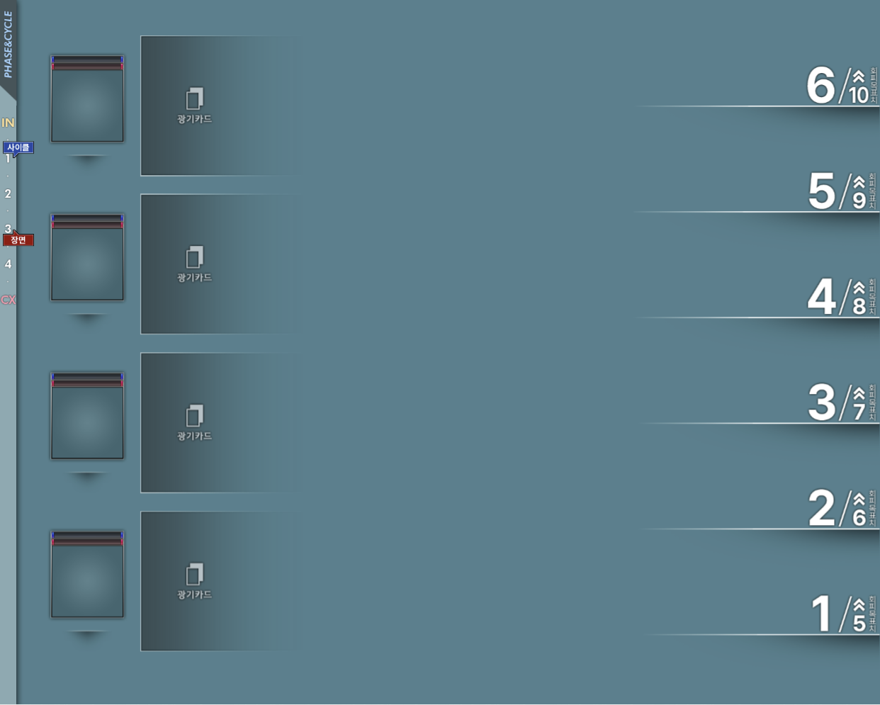 시나리오에 맞춰 사이클과 장면 숫자를 같이 쓸지, 사이클과 장면 숫자를 따로 쓸지 취향껏 배열합니다. 도입과 클라이맥스 표시 없이 메인 페이즈만 넣을 수도 있고…