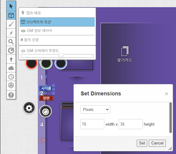 오브젝트와 토큰 레이어에 [라벨사이클_70x35.png]와 [라벨장면_70x35.png]을 70x35 사이즈로 토큰을 나열합니다.