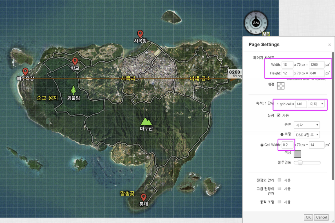 축척을 적용한다면 셀 너비 0.2 기준으로 한 셀에 140m를 적용시키면 섬 면적 38만㎢ 를 대강 맞출 수 있습니다. (눈금 색상 투명 변경 가능)